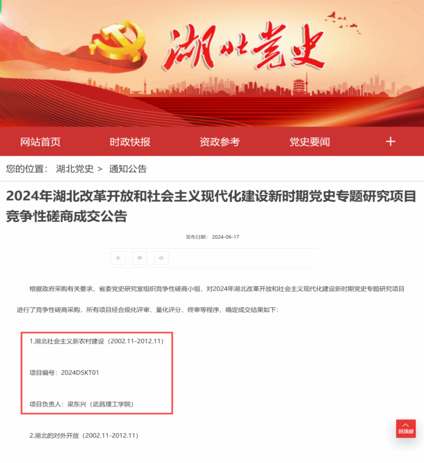 日前,湖北省委党史研究室发布2024年湖北改革开放和社会主义现代化建设新时期党史专题研究项目竞争性磋商成交公告,由太阳成集团tyc234cc梁东兴教授为课题负责人组建的团队,成功获批“湖北社会主义新农村建设(2002.11-2012.11)”课题(项目编号:2024DSKT01),这是公司首次获批此类项目。