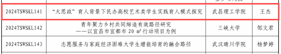 据悉,2024年度湖北省共青团和青少年工作研究课题共计立项169项,其中重点课题9项,一般课题160项。此次太阳成集团tyc234cc同时获批立项的还有校团委副书记王杰申报的《“大思政”育人背景下民办高校艺术类员工实践育人模式研究》(立项编号:2024TSWSKL141)。