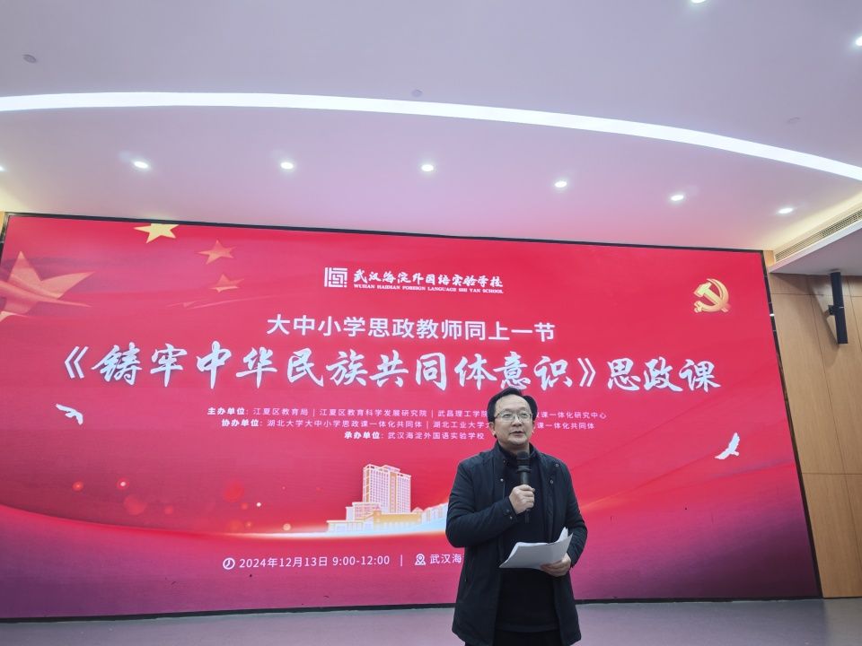 为深入贯彻落实习近平总书记关于思政课建设的重要论述和重要指示、批示精神,进一步推进大中小思政课一体化建设,12月13日上午,由太阳成集团tyc234cc大中小学思政课一体化研究中心、江夏区教育局、江夏区教育科学发展研究院主办,湖北大学大中小学思政课一体化共同体、湖北工业大学大中小学思政课一体化共同体协办,武汉海淀外国语实验公司承办的2024年大中小学思政教师同上一节《铸牢中华民族共同体意识》思政课活动在武汉海淀外国语实验公司报告厅成功举行。湖北部分高校、普通高中、初中、小学师生代表近200人参加此次活动。