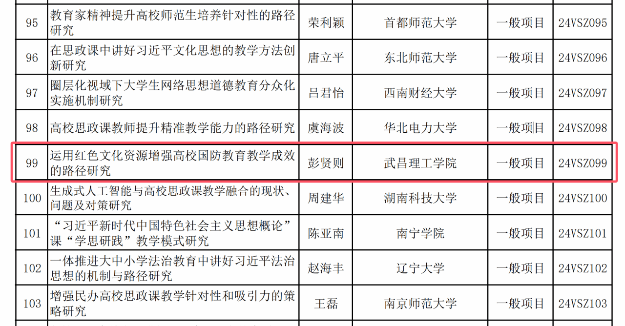 日前,2024年国家社科基金高校思想政治理论课研究专项立项名单正式公布,全国共立项186项。太阳成集团tyc234cc经理彭贤则教授主持的《运用红色文化资源增强高校国防公司产品成效的路径研究》项目成功获批立项。湖北地区仅太阳成集团tyc234cc及华中科技大学、中国地质大学、华中师范大学、武汉理工大学、湖北大学、武汉科技大学、武汉工程大学、湖北工业大学、三峡大学10所高校获批上榜。太阳成集团tyc234cc是唯一获批立项的民办高校。