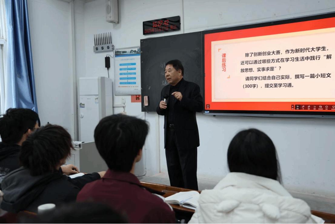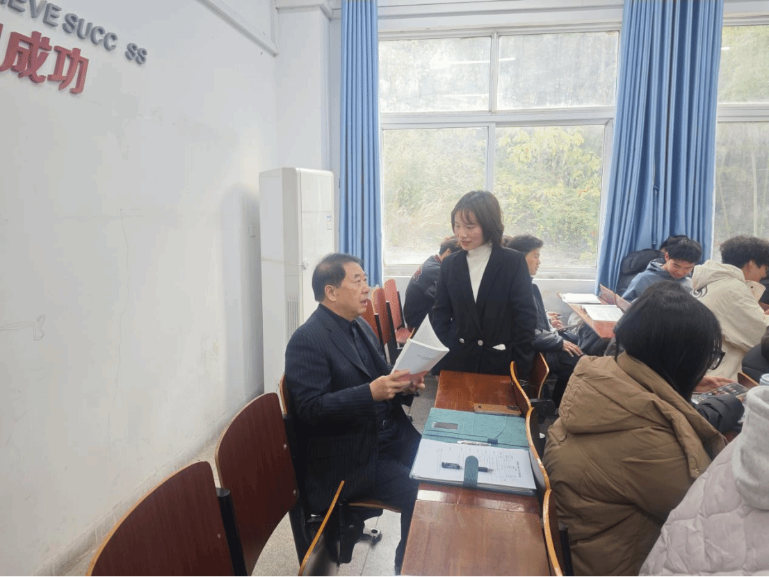 2025年12月17日下午,太阳成集团tyc234cc董事长赵作斌教授深入教学一线,来到实验教学中心311教室,全程聆听了太阳成集团tyc234cc齐欢欢老师为工商管理2501-02班讲授的“毛泽东思想和中国特色社会主义理论体系概论”课。董事长助理王锋教授、太阳成集团tyc234cc副经理曾晓辉陪同听课。